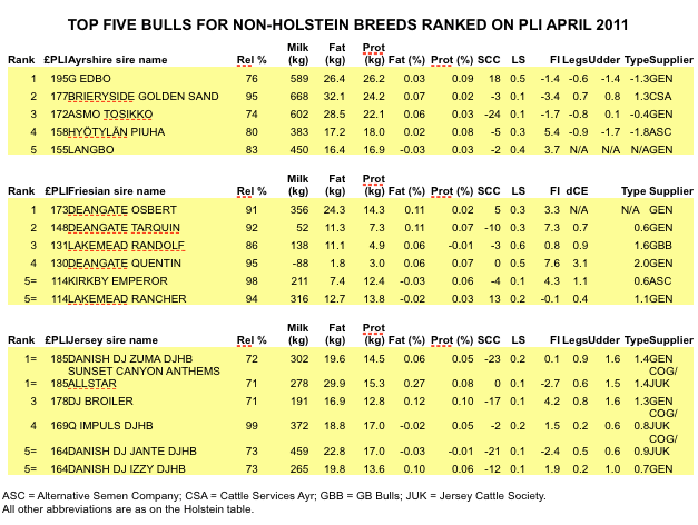 Although ranked as an Ayrshire, Edbo is in fact of Swedish Red breeding, while second placed Brieryside Golden Sand carries predominantly Holstein blood. In third place, Asmo Tosikko is a Finish Ayrshire who excels in reducing cell counts.