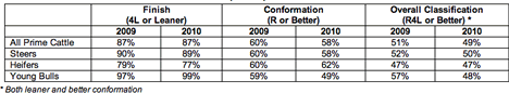 This would account for the fact that the proportion of heifer carcases meeting the market specification was maintained at 2009 levels by relatively better levels of conformation. And this despite some reduction in quality of finish resulting from the difficulties of the season.