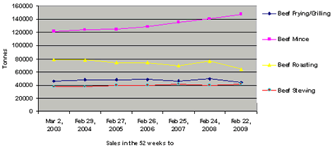 After a brief renaissance in 2007, both frying and grilling steak and roasting sales have returned to their longer term downward trend. Frying and grilling beef is now just under 15% of total sales and roasting beef has fallen back noticeably to around 21% of consumption (compared to 28% in 2003) due as much to the reduced frequency of formal meal occasions in most British households as to current pressures on income. The continued decline in national prime beef supplies may, however, help offset any further reduction in hindquarter demand.